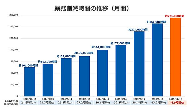 また、業務削減時間を見ると、1人あたりで約46.9時間/月の削減を実現しており、前回調査から約3.7時間増加した。