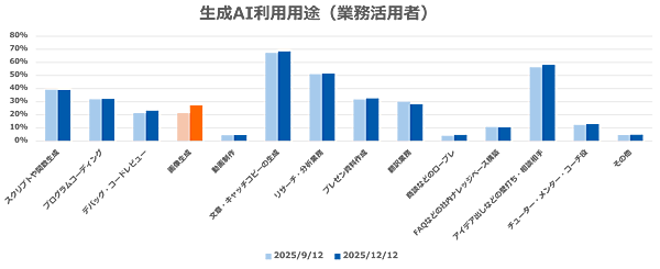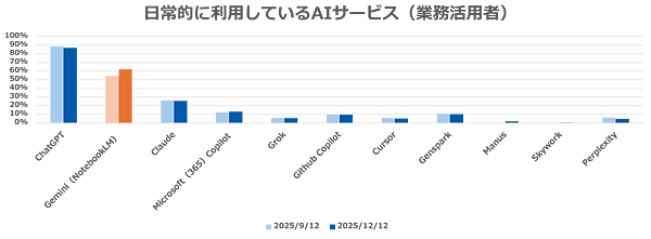 生成AIの利用用途を聞くと、「画像生成」が前回から大きく伸びる結果に。日常的に利用しているサービスでは「Gemini(NotebookLM)」の利用率が大幅に増加しており、Googleが提供する画像生成AI「nanobanana(ナノバナナ)」をはじめとした画像系AIの普及が進んでいることがわかった。