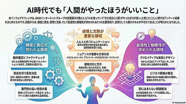最後に、AIを利用する中で、人間がやった方が良いと感じる仕事について聞くと、「最終確認やファクトチェック」「現場を見て決める、その場の空気で判断する場合」「価値判断のように答えが1つじゃない領域」といったコメントが寄せられた。