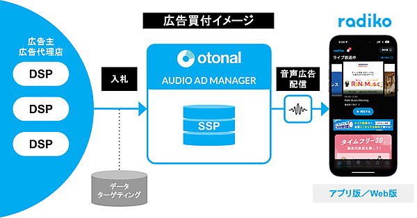 デジタル音声広告事業のオトナルは、radikoが運営する国内最大規模のインターネットラジオ配信サービス「radiko(ラジコ)」に対して、SSP(Supply-Side Platform:媒体社のための広告配信プラットフォーム)を接続したと1月15日に発表した。SSPを介して、広告主や広告代理店の持つDSP(Demand-Side Platform:広告主のための広告配信プラットフォーム)からプログラマティック(運用型)の広告枠を購入できるようになった。