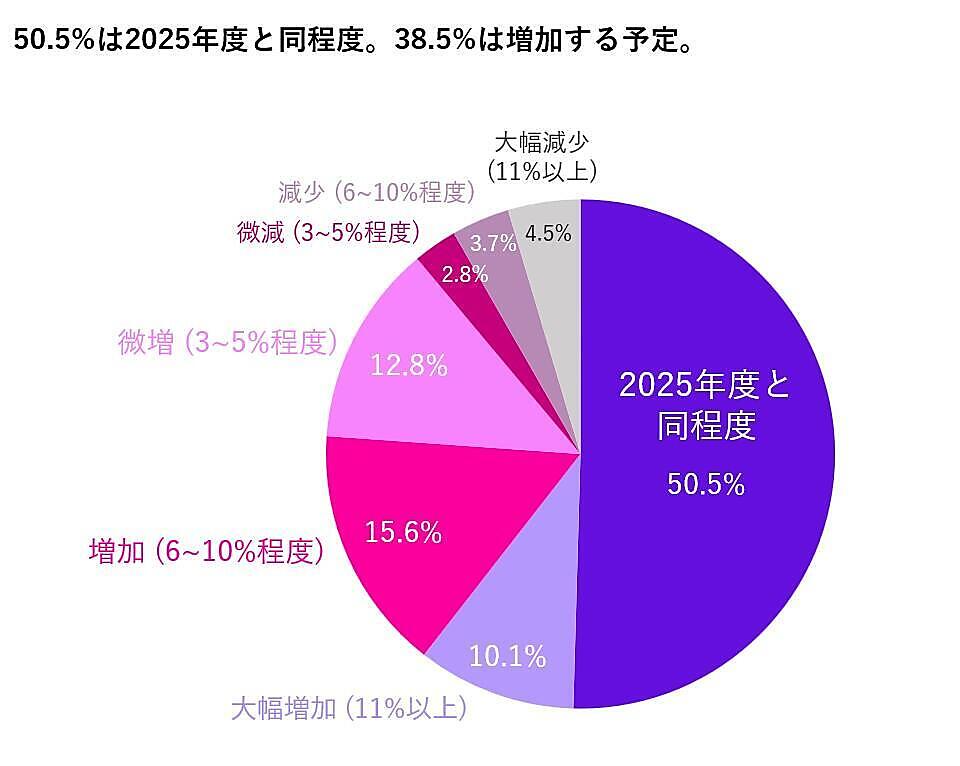 まず、2026年度の広告・マーケティング予算の増減予定について聞くと、50.5%が「2025年度と同程度」と回答した。一方で、「増加する」の合計は38.5%となり、前年を6.2ポイント上回った。