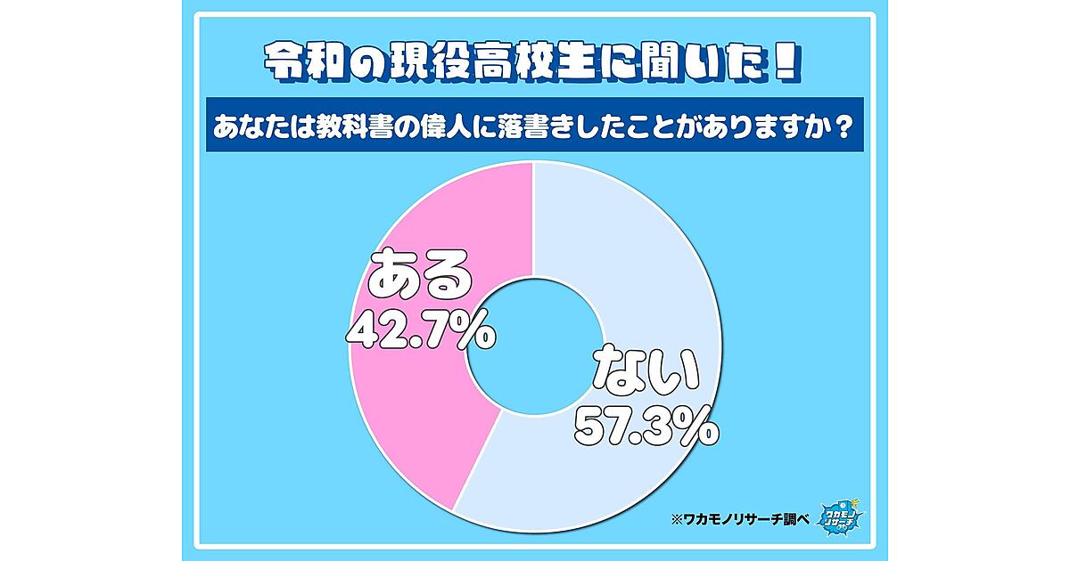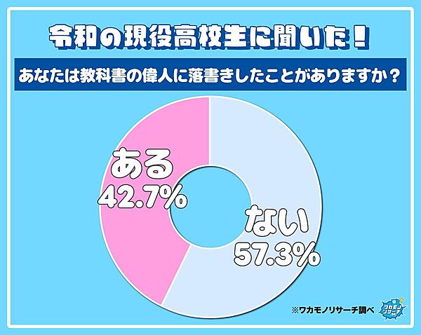 このアンケートではまず現役高校生に「教科書の偉人に落書きしたことがあるか?」と聞くと、「ある」は全体の42.7%。「教科書に顔が載ってるたびにやってます笑」「名前を書ききれないほど、ほとんどの偉人に落書きしてました」といった回答があがっている。「授業がつまらないから」という声も多い。