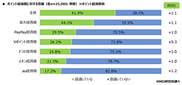 続いて、ポイント経済圏を意識しているかを聞くと、全体では61.9%の人が「意識している」と回答した。2025年7月の調査と比べると1.1ポイント増となっている。経済圏別で見ると、「意識している」の割合が最も高いのは「楽天経済圏」で44.1%。以下、「PayPay経済圏」が29.5%、「Vポイント経済圏」が26.2%と続いた。