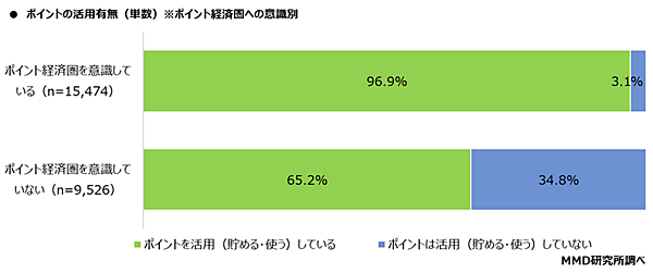 さらに、共通ポイントの活用状況をポイント経済圏への意識別に見ると、経済圏を意識している人ではポイント活用率96.9%、意識していない人では65.2%と、31.7ポイントの差が見られた。
