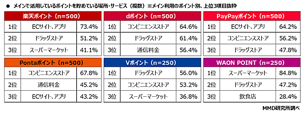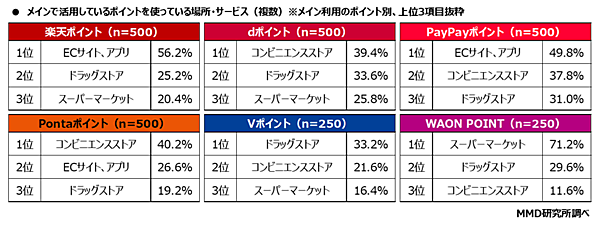 メインで活用しているポイントについて、貯めている場所・使っている場所を聞くと、楽天ポイント、PayPayポイントは「ECサイト、アプリ」での利用が中心だった。一方で、dポイント、Pontaポイントは「コンビニ」、Vポイントは「ドラッグストア」、WAON POINTは「スーパーマーケット」と細かく使い分けられていることがわかった。