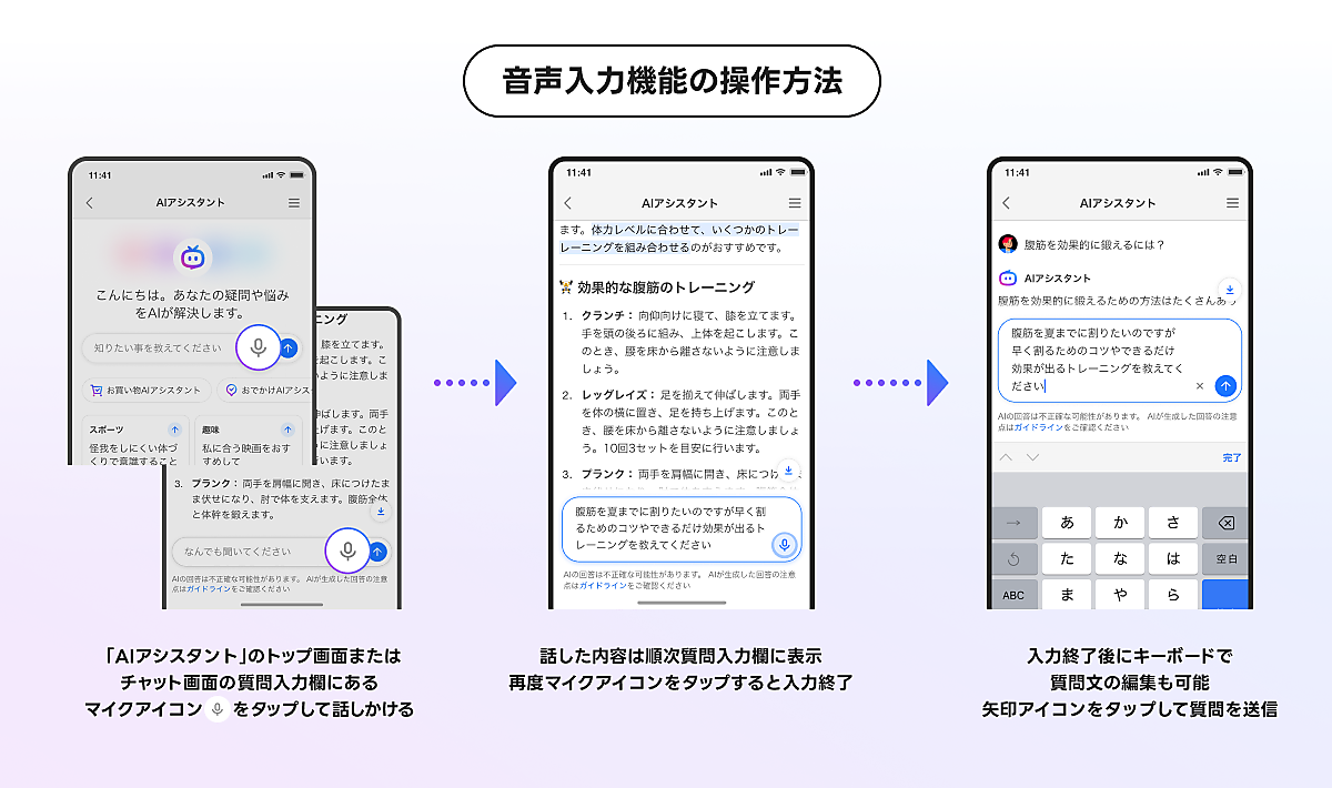 最初の質問をした日から3カ月分のチャット履歴を一覧で表示する。1月13日以降分が順次表示される。入力方法としてこれまでのテキストに加え、音声にも対応した。パソコンやスマートフォンの設定、ブラウザ、アプリのマイク設定を有効にしてマイクから直接話しかけることで、スムーズな対話が可能になる。音声入力に対応していないブラウザもある。