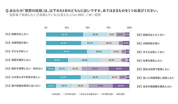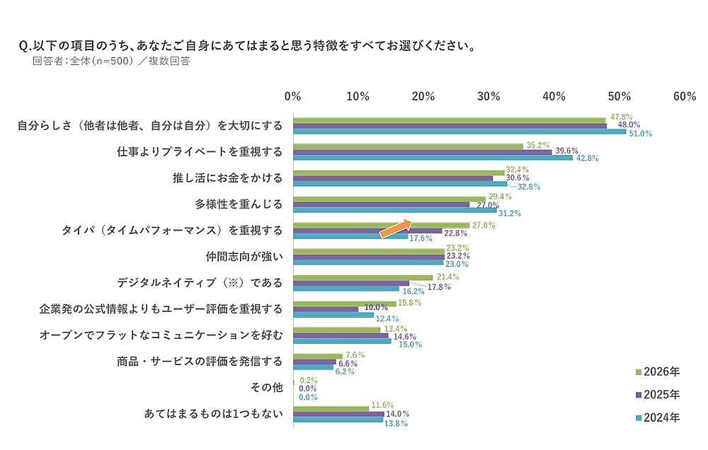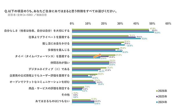 続いて新成人自身について知るため「価値観」について選択式で聞くと、「自分らしさを大切にする」47.8%がポイントを落としつつも前年に続き1位。2位の「仕事よりプライベートを重視する」35.2%も前年より数値は下がっている。一方で「タイパを重視する」27.0%は前年から4.2ポイント増で徐々に数字を伸ばしている。