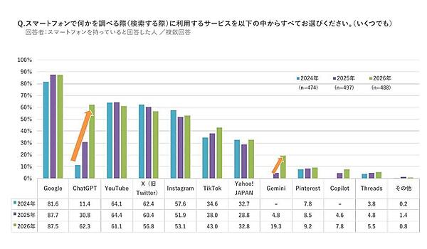 さらに、デジタル利用について質問。「スマホで調べものをする際に利用するサービス」では1位「Google」87.5%が前年同様1位。一方2位「ChatGPT」は62.3%とほぼ倍増し、YouTube、X、Instagramを追い抜いた。「Gemini」19.3%(前年比14.5ポイント増)と成長しており、生成AIが検索シーンを変えている様子がうかがえる。