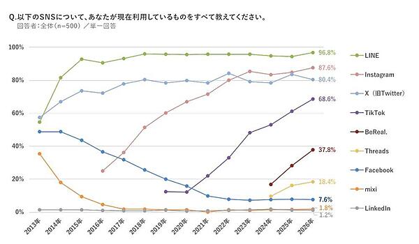 「SNSの利用」について聞くと、「LINE」96.8%、「Instagram」87.6%、「X」80.4%のトップ3は利用率にほぼ変化なしだが、4位の「TikTok」68.6%はここ数年上昇が続いており、6年で5.6倍になった。「BeReal.」37.8%も人気上昇しており、タイパ重視を背景に「ショート動画」系SNSが支持を集めている。