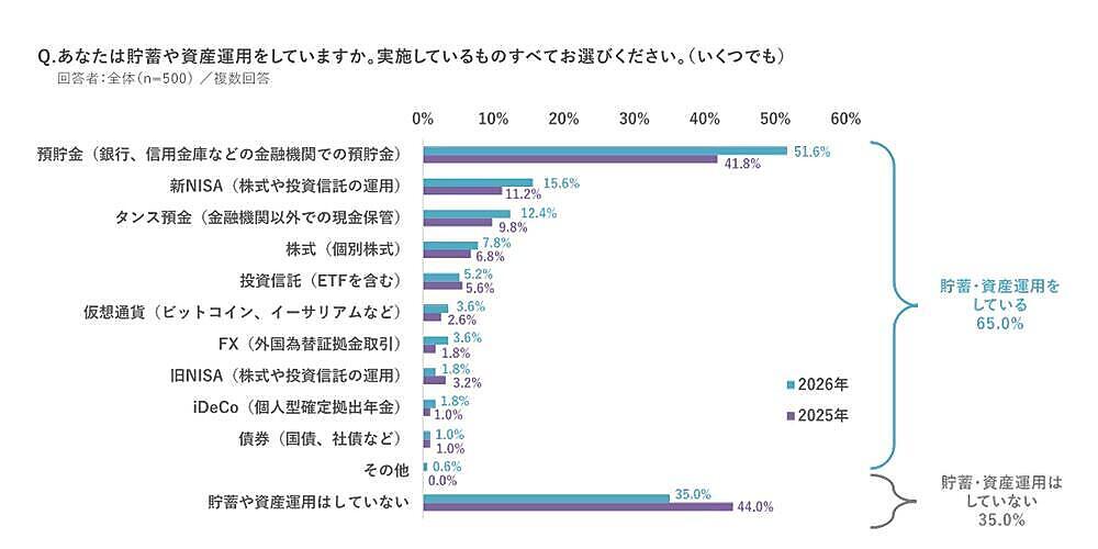 「貯蓄・資産運用」について聞くと、なんらかの貯蓄・資産運用をしている人は65.0%で、前年より9.0ポイント増と大きく上昇した。基本は「預貯金」51.6%が最多だが、「新NISA」15.6%、「タンス預金」12.4%がそれに続いており、いずれも前年より増加している。