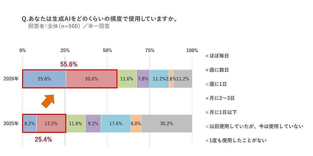 「生成AIの利用頻度」を聞くと、「ほぼ毎日」25.6%、「週に数日」30.0%が合計で半数を超えた。