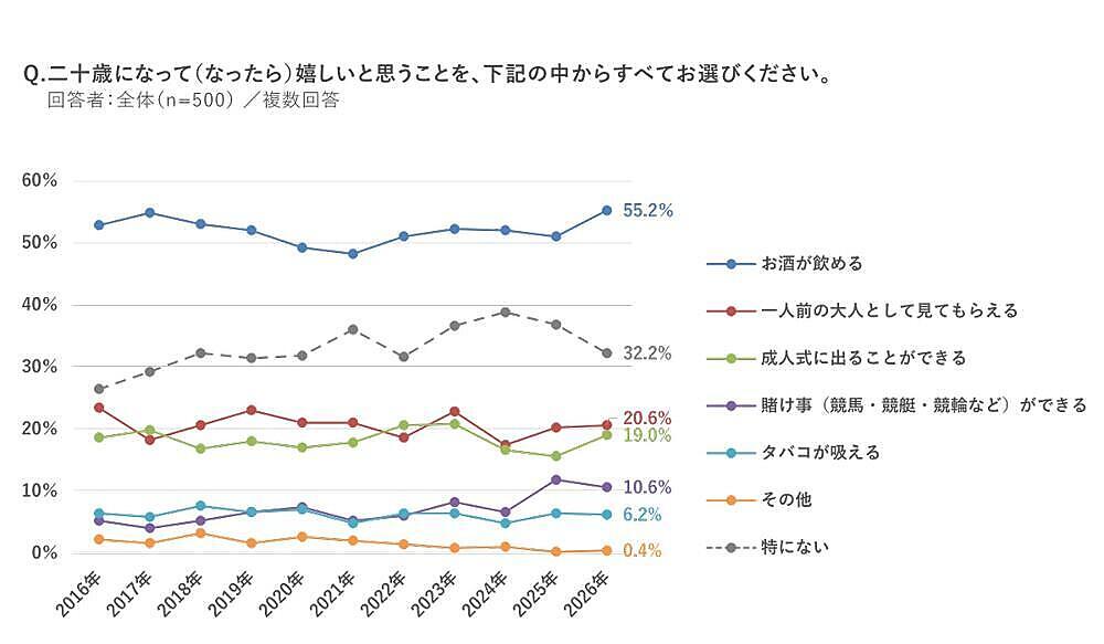 なお「成人式(二十歳の集い)に参加するか」を聞くと、「参加する」68.2%で、減少傾向から一転して回復した。また「二十歳になって嬉しいこと」1位は、10年連続の「お酒が飲める」55.2%だったが、この数値は過去最高とのこと。