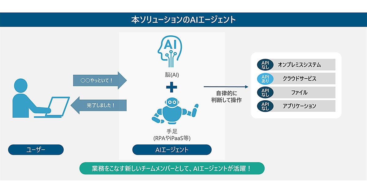 RPAはパソコンの事務作業を自動化する技術で、人が日常的に行うマウス操作やキーボード入力などの手順を記録し、高速で正確に実行する。AIエージェント活用業務自動化ソリューションは、AIがRPAロボットを手足のように動かすAIエージェントの活用に向け、ノーコード・ローコードでのAIエージェント導入教育、開発、運用を支援。人との協働作業を実現するプラットフォームとして提供する。
