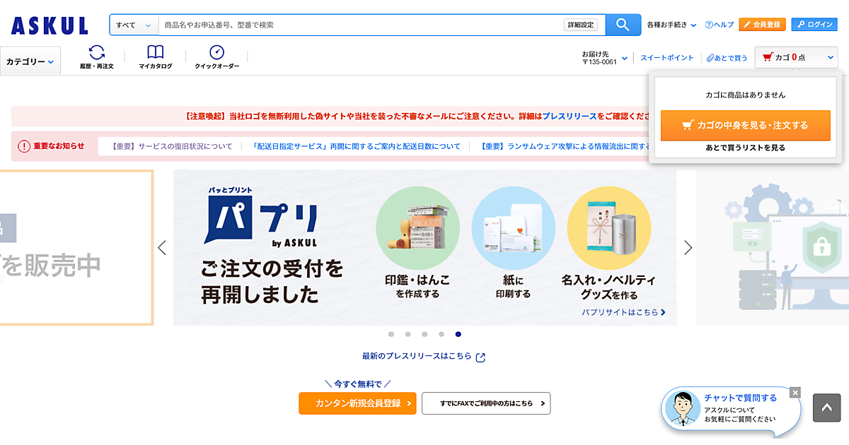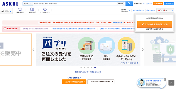 ASKULは、事務用品・工具などビジネス用が中心の事業所向け通販。LOHACOに先行して復旧を進め、商品や出荷拠点を限定して12月3日にウェブサイトでの注文を再開していた。今回、停止前に提供していた全ての商品の購入が可能になり、「配送日指定」「時間帯指定配送」「置き場所指定配送」「組立設置」の各サービスを再開した。