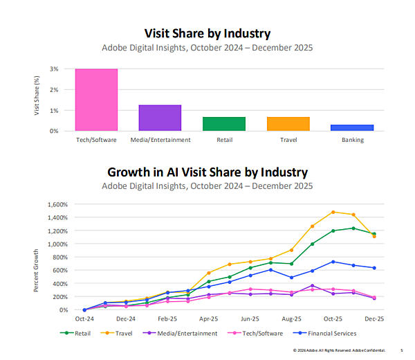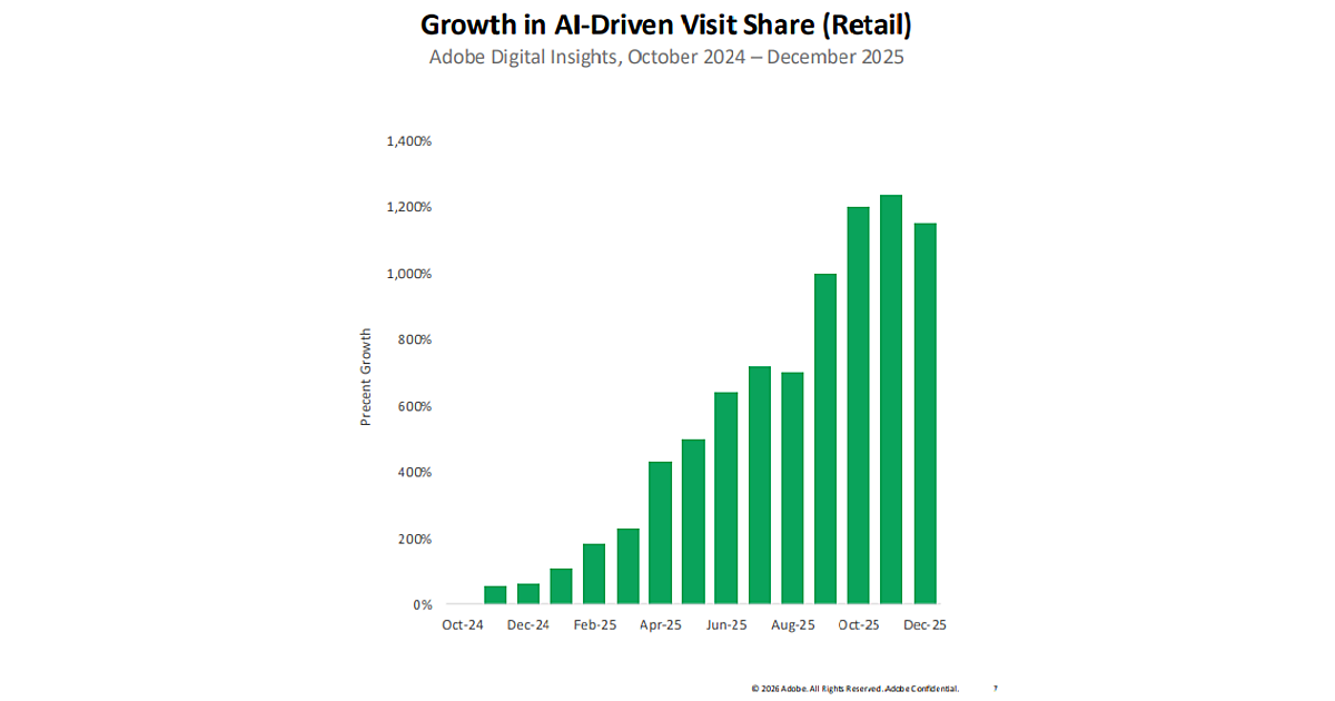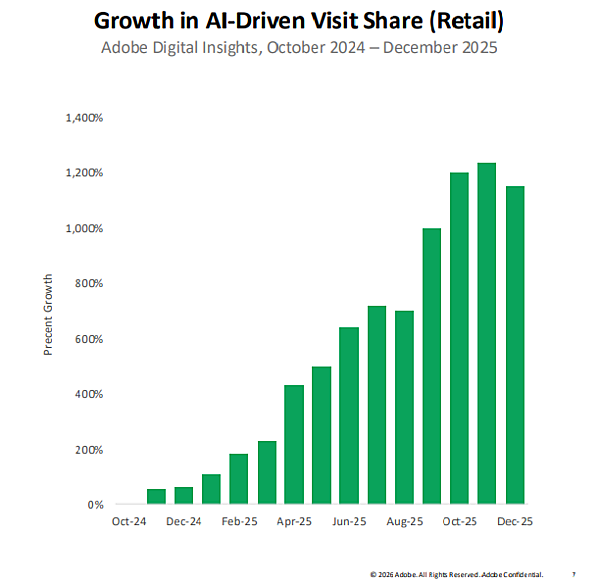 アドビは、2026年1月12日(米国時間)に、生成AI経由のトラフィックの動向を分析した四半期レポートを発表した。