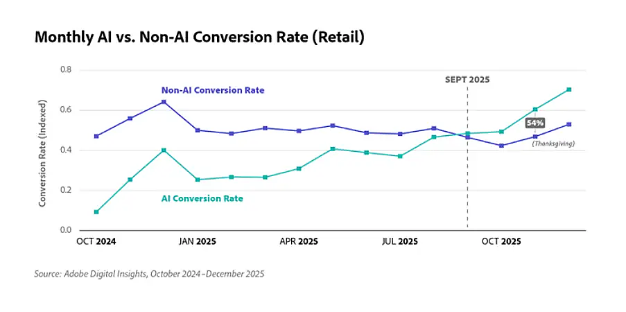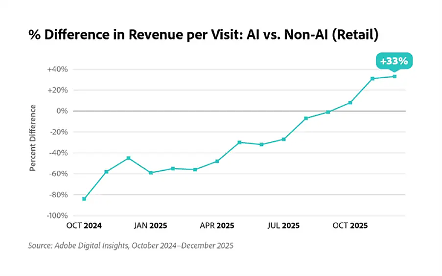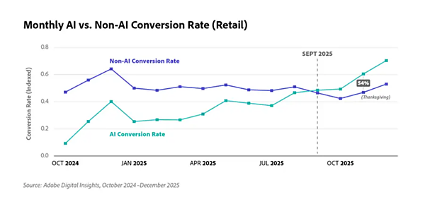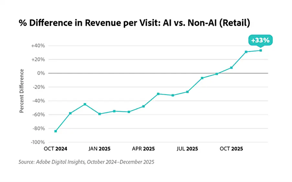 さらに、小売業界における1訪問あたりの売上(RPV)を見ると、2025年後半に大きく増加しており、直近ではAI経由が非AI経由を33%上回る結果に。同社では、今シーズンのAI経由RPVが年初来で254%増加したとも報告しており、こうした傾向は今後も続くと予測している。
