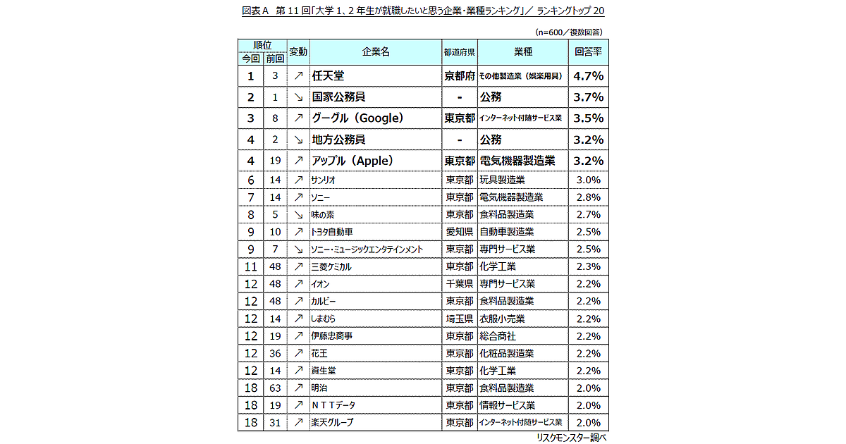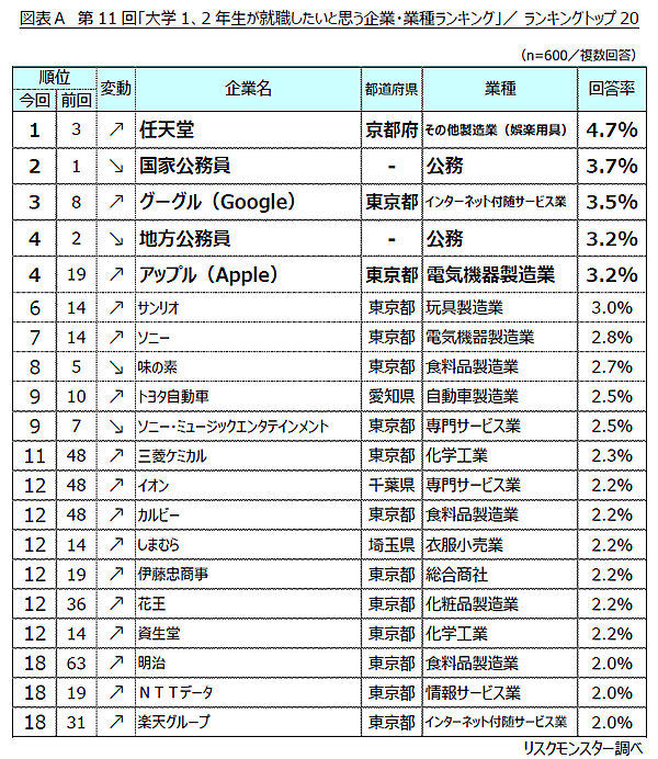 大学1・2年生が就職したい企業1位は「任天堂」
