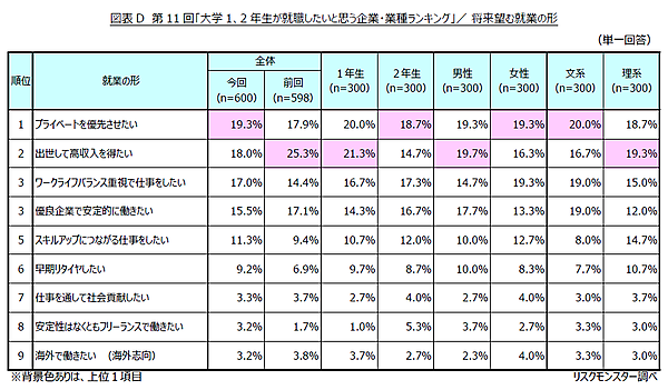 続いて、将来望む働き方を聞くと、全体では「プライベートを優先させたい」が19.3%で最も多く、前年よりもやや増加した。以下、「出世して高収入を得たい」(18.0%)、「ワークライフバランス重視で仕事をしたい」(17.0%)、「優良企業で安定的に働きたい」(15.5%)と続いている。また、年齢・性別ごとに見ると、1年生や男性は「出世・高収入」を重視する傾向が強く、2年生や女性は「プライベートを優先したい」という人が多かった。