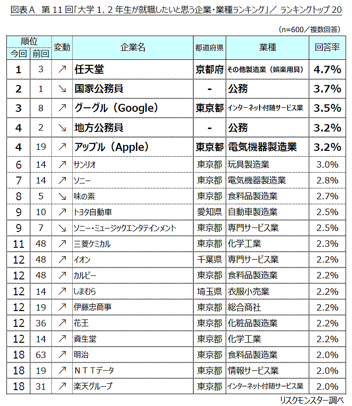一方で、3位には昨年8位から順位を上げた「グーグル」、同率4位には昨年19位からジャンプアップした「アップル」がランクイン。新たにトップ20に入った6社を含め、16社が順位を上げており、人気企業の顔ぶれや順位に変化が見られる結果となった。