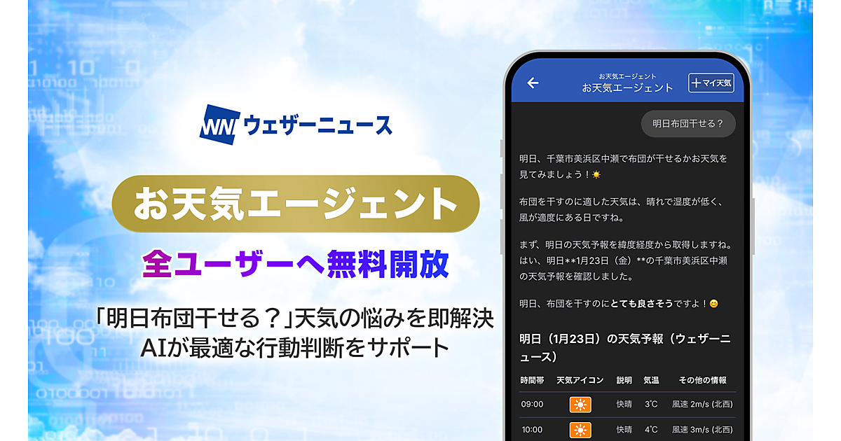 気象情報サービス事業のウェザーニューズは、天気アプリ「ウェザーニュース」で、有料会員限定で2025年1月から提供していた生成AIチャット機能「お天気エージェント」を、無料ユーザーを含む全ユーザーに提供を始めたと1月28日に発表した。「天気についてより気軽に相談したい」「専門的な情報をわかりやすく知りたい」という多くの声に応えて、アプリの全ユーザーに無料開放した。