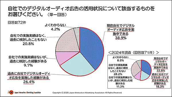 まず「デジタルオーディオ広告の活用状況」について聞くと、「現在自社でデジタルオーディオ広告を実施中である」は38.9%。続いて「実施した経験がある」26.4%が前年より大きく増加し、2025年は65.3%でデジタルオーディオ広告の活用が見られた。