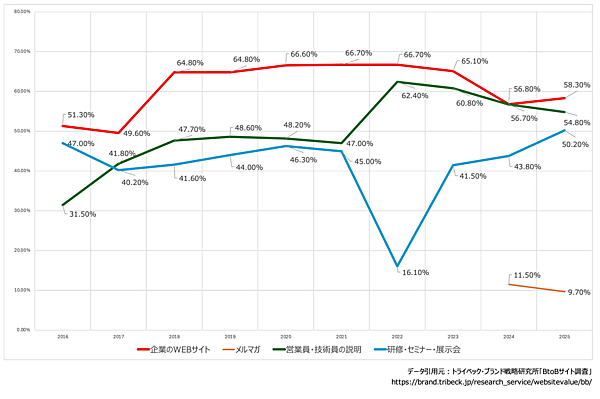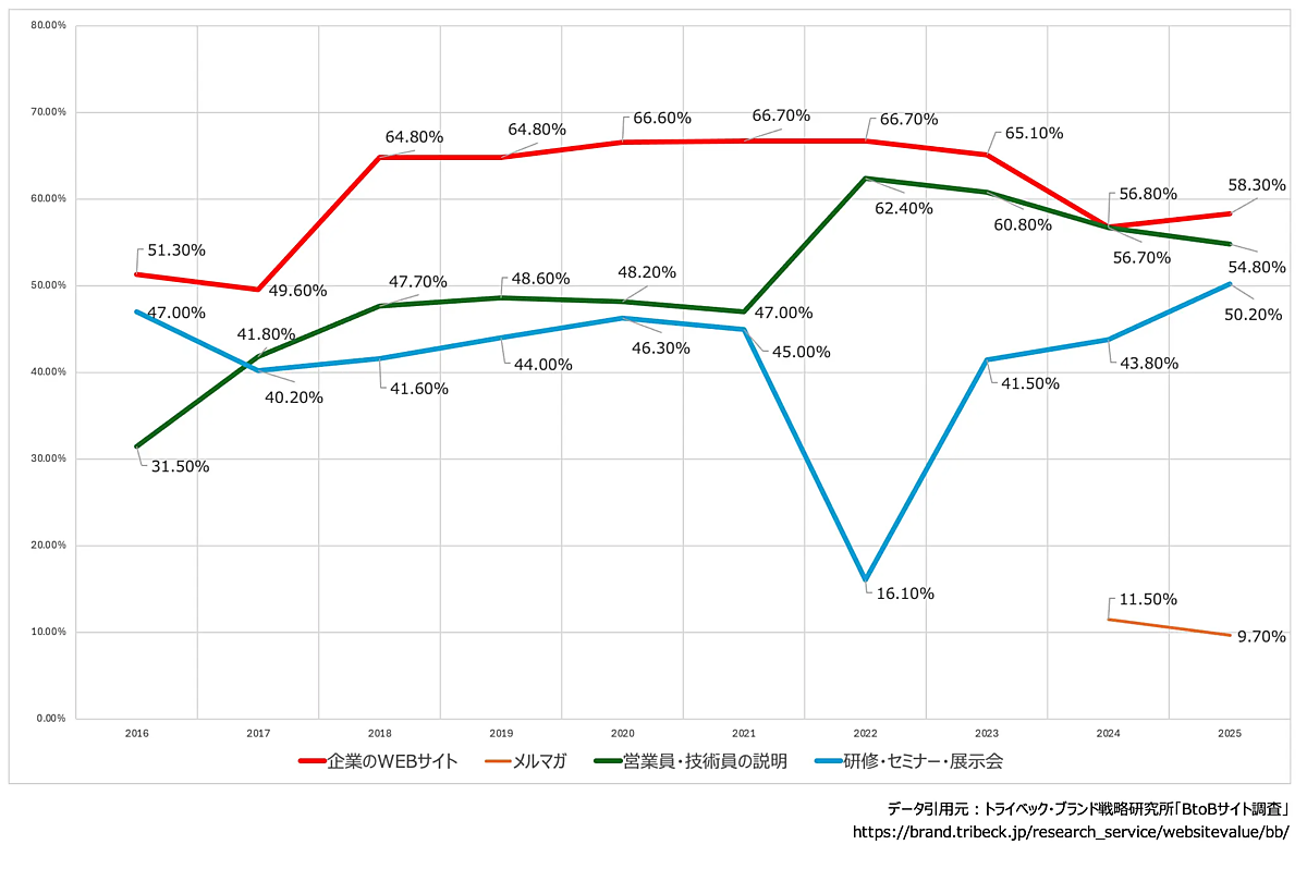 一方で、BtoB企業の買い手側(顧客側)の意識について、製品やサービスの導入を検討する際に、何を情報源にしているのかを見ると、「企業のWEBサイト」が全ての年で最多となった。また、「営業員・技術員の説明」は2022年以降徐々に減少しており、「研修・セミナー・展示会」は一時的に落ち込んだものの、ここ数年で再び増加していることがわかった。