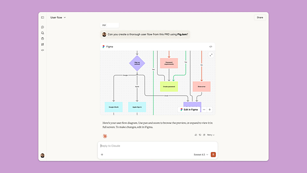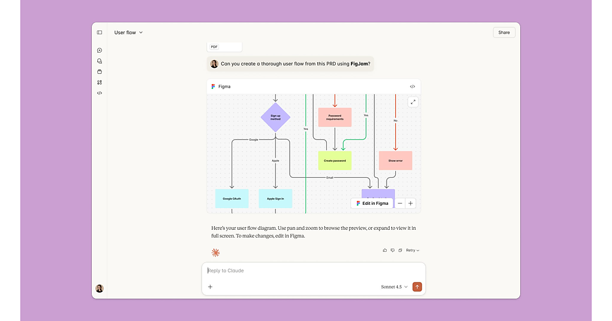 デザインプラットフォーム事業の米国Figma(フィグマ)は、米国Anthropic(アンスロピック)の生成AI「Claude(クロード)」と連携し、Claude上の「Figma MCPアプリ」で編集可能な「FigJamダイアグラム」を生成する新機能の提供を始めたと1月27日(米国時間)に発表し、日本法人のFigma Japanが日本語訳を1月29日に公表した。図形や線、記号で整理したダイアグラムやガントチャート(工程表)などを作成できる。