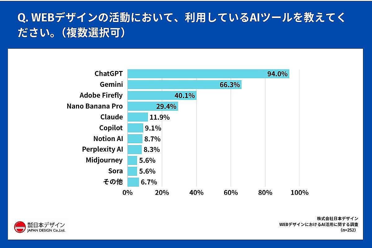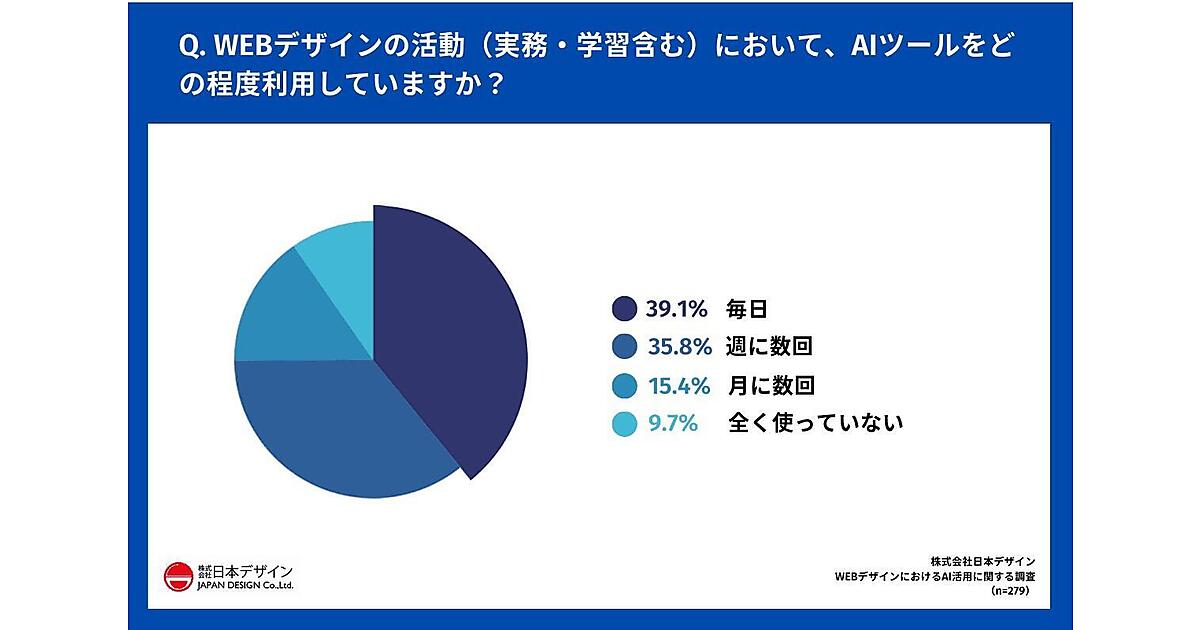 日本デザインは、「WebデザインにおけるAI活用」に関する調査結果を発表した。Webデザインの実務または学習に取り組んでいる279人が回答している。