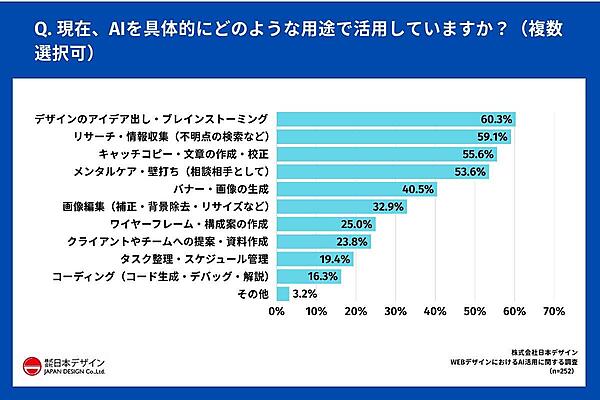 具体的な「利用AIツール」では、「ChatGPT」94.0%が最多で、「Gemini」66.3%がそれに続く。「活用用途」では、「デザインのアイデア出し・ブレインストーミング」60.3%が最多で「リサーチ・情報収集(不明点の検索など)」59.1%がほぼそれに並ぶ。「メンタルケア・壁打ち(相談相手として)」53.6%、「キャッチコピー・文章の作成・校正」55.6%との声も多い。