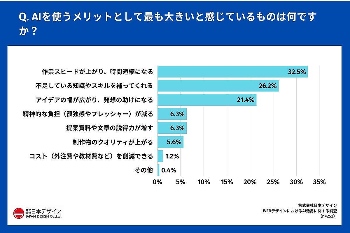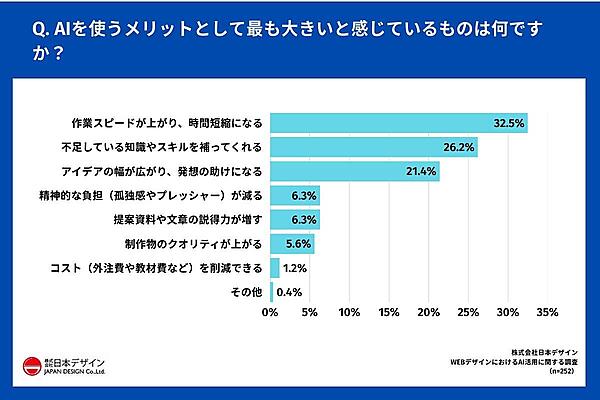 「AI活用のメリット」を聞くと、「作業スピードが上がり、時間短縮になる」が32.5%が特に多く、「不足している知識やスキルを補ってくれる」26.2%、「アイデアの幅が広がり、発想の助けになる」21.4%を上回った。
