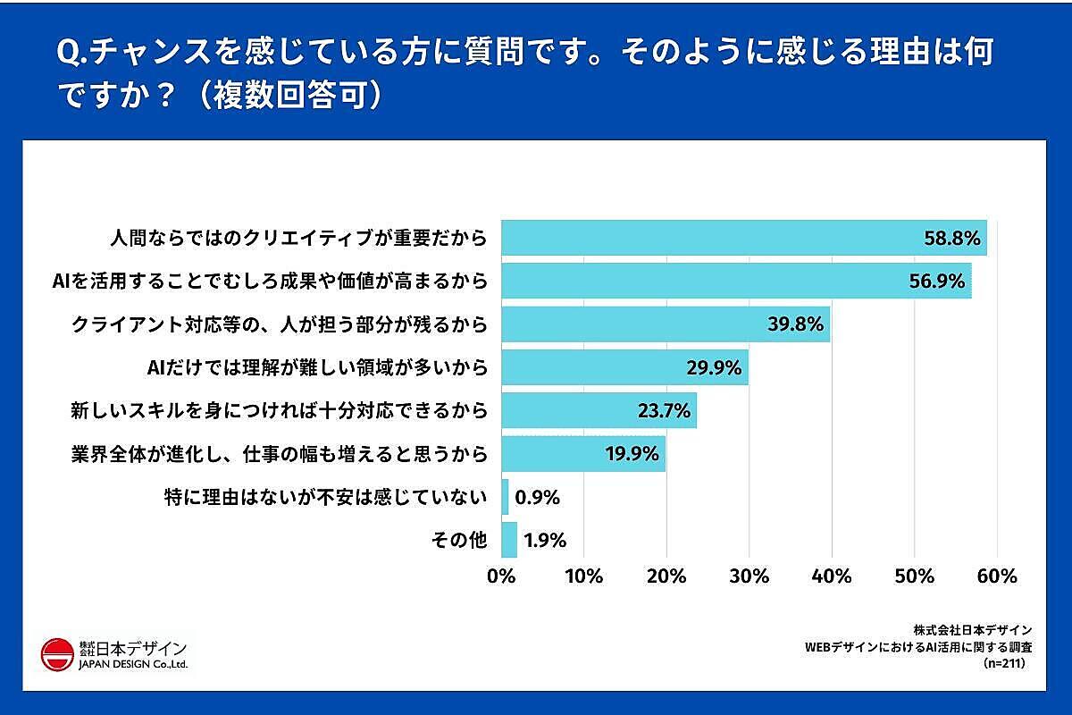 「AIの進化は、Webデザイナーにとってチャンスか?」を聞くと、「大きなチャンス(追い風)だと感じる」32.3%、「どちらかと言えばチャンスだと感じる」43.4%で、肯定的な人が多い。「そのように感じる理由」では、「人間ならではのクリエイティブが重要だから」58.8%、「AIを活用することでむしろ成果や価値が高まるから」56.9%が特に多く、AIの活用より“非AIの再評価”が注目されているようだ。