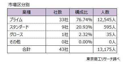 早期・希望退職の募集が判明した上場43社の市場区分を見ると、「東証プライム」が33社(構成比76.7%)、東証スタンダードは9社(同20.9%)だった。市場区分別の募集人数では、「東証プライム」が1万2545人、「東証スタンダード」が595人、「グロース」が35人で、東証プライムの募集人数が9割超(構成比95.2%)を占める。