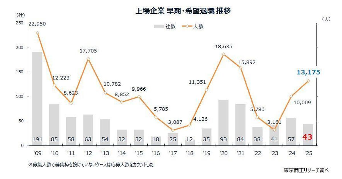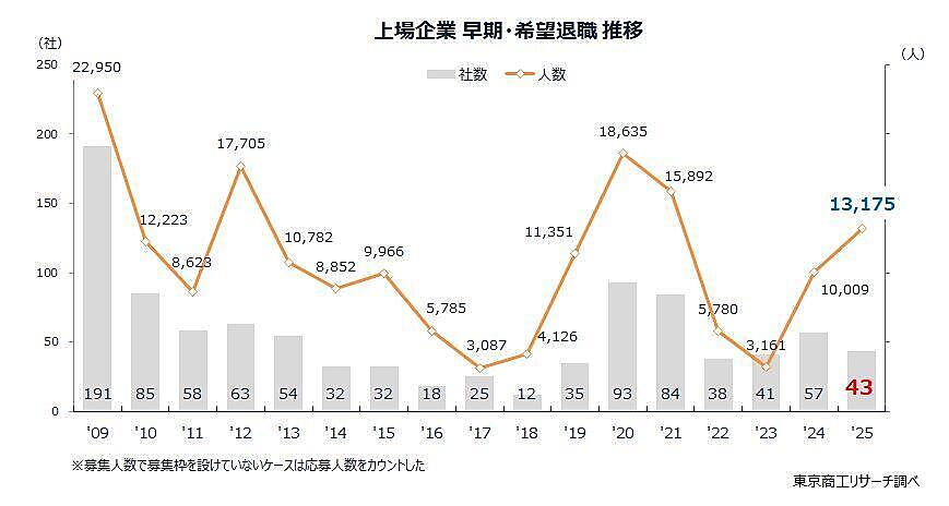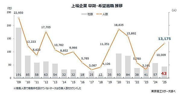 東京商工リサーチ(TSR)は、上場企業の「早期・希望退職募集状況」に関する調査結果を発表した。2025年に「早期・希望退職の募集」が判明した上場企業は43社(前年57社)で24.5%減少したが、募集人数は1万3175人で31.6%の急増となった。