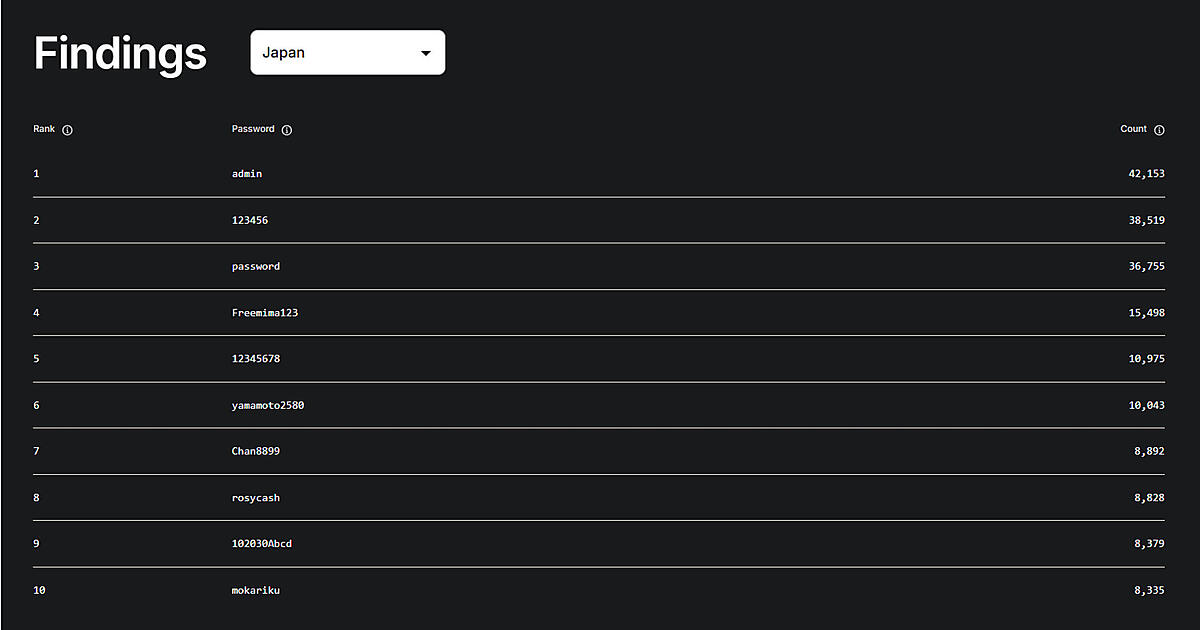 調査によると、日本国内で最も多く使われているパスワードランキングの1位は、デバイスの初期パスワードである「admin」だった。2位は“最弱のパスワード”とも言われる「123456」で、3位は「password」と続いている。
