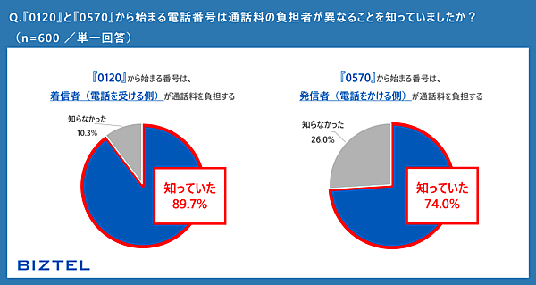 まず、「0120」と「0570」のそれぞれの番号が持つ意味を知っていたかを聞くと、「0120」では89.7%、「0570」では74.0%が「知っていた」と回答した。