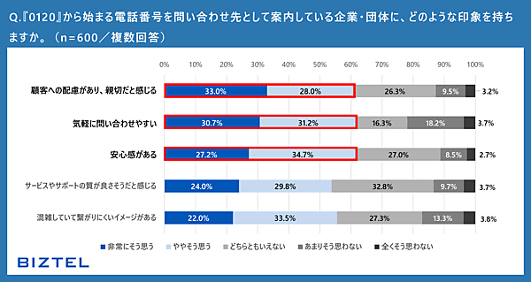 なお、企業の問い合わせ窓口において、「0120」は通話料を着信側が負担する番号で、「0570」は発信者側が負担する番号である。本調査では、これらの番号の認知度や、消費者からの印象を比較・分析している。