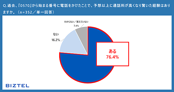 実際に「0570」から始まる番号に電話をかけたことで、想像以上に通話料が高くて驚いた経験があるかを聞くと、76.4%の人が「ある」と回答。そのうち95.9%の人が「発信者が通話料を負担することを認識していた」と回答しており、仕組みを理解していても割高に感じる人が多いことがわかった。