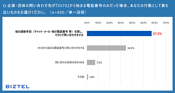 最後に、企業・団体の問い合わせ先が0570番号のみだった場合どうするかを聞くと、「他の問い合わせ手段を探す」が57.2%、「問い合わせ自体をあきらめる」が7.3%となり、「0570番号に問い合わせをする」は34.5%にとどまった。