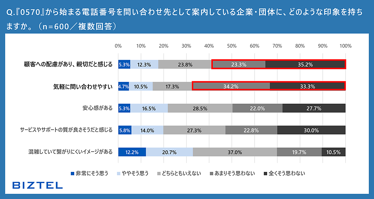 一方で、0570番号を採用している企業への印象を聞くと、「顧客配慮が感じられない」「問い合わせがしにくい」といった否定的な意見が目立つ結果に。通話料の特性を理解している消費者にとっては、企業イメージにマイナスの影響を与えることがわかった。