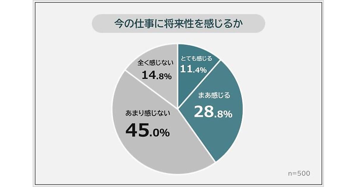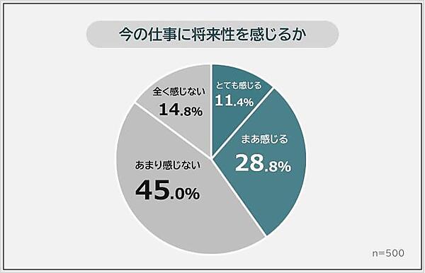 まず「今の仕事に将来性を感じているか」を聞くと、「とても感じる」11.4%、「まあ感じる」28.8%で約4割にとどまり、仕事の将来性に不安を抱えている人のほうが多い。