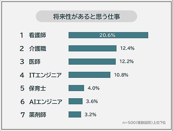 そこで「将来性があると思う仕事」を聞くと、1位は「看護師」20.6%、以下「介護職」12.4%、「医師」12.2%と、医療・福祉系が続く。「保育士」「薬剤師」も上位に入っており、いわゆるエッセンシャルワーカーが「社会に必要不可欠な職業」「AIで代替できない」と認識されているようだ。また高齢化社会の影響なども考えられる。一方、4位に「ITエンジニア」、6位に「AIエンジニア」が入っており、産業構造を支える存在も人気のようだ。