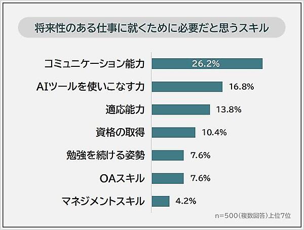 さらに「将来性のある仕事に就くために必要だと思うスキル」を聞くと、「コミュニケーション能力」26.2%が最多。以下2位「AIツールを使いこなす力」16.8%、「適応能力」13.8%、「資格の取得」10.4%、「勉強を続ける姿勢」7.6%が上位で、幅広く普遍的なスキルを身につける必要がありそうだ。