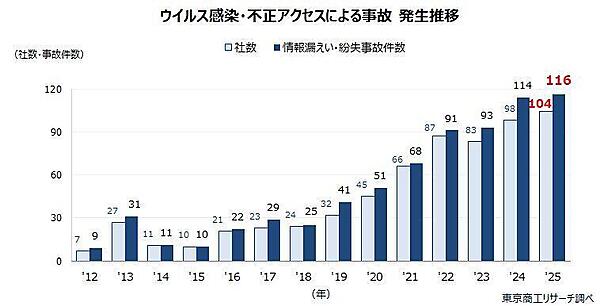 「ウイルス感染・不正アクセス」について詳しく見ると、発生件数は116件で、前年を2件上回り、2年連続の100件台で過去最多を記録した。特に2025年は、ランサムウェアによる不正アクセス被害が多発している。