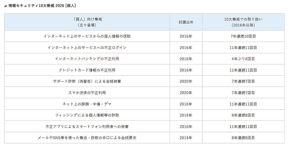 独立行政法人 情報処理推進機構(IPA)は、「情報セキュリティ10大脅威2026」を公開した。2025年に発生した情報セキュリティの事故・事件に対して、約250名の「10大脅威選考会」メンバー(情報セキュリティ分野の研究者、企業の実務担当者など)が投票を行い、「個人」「組織」の立場でそれぞれ上位10件を選出している。なお個人向け脅威については、下位の脅威への注意が疎かになることを避けるため、五十音順での紹介となっている。