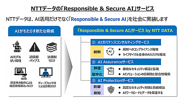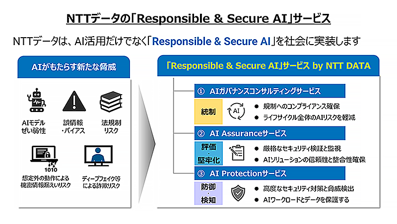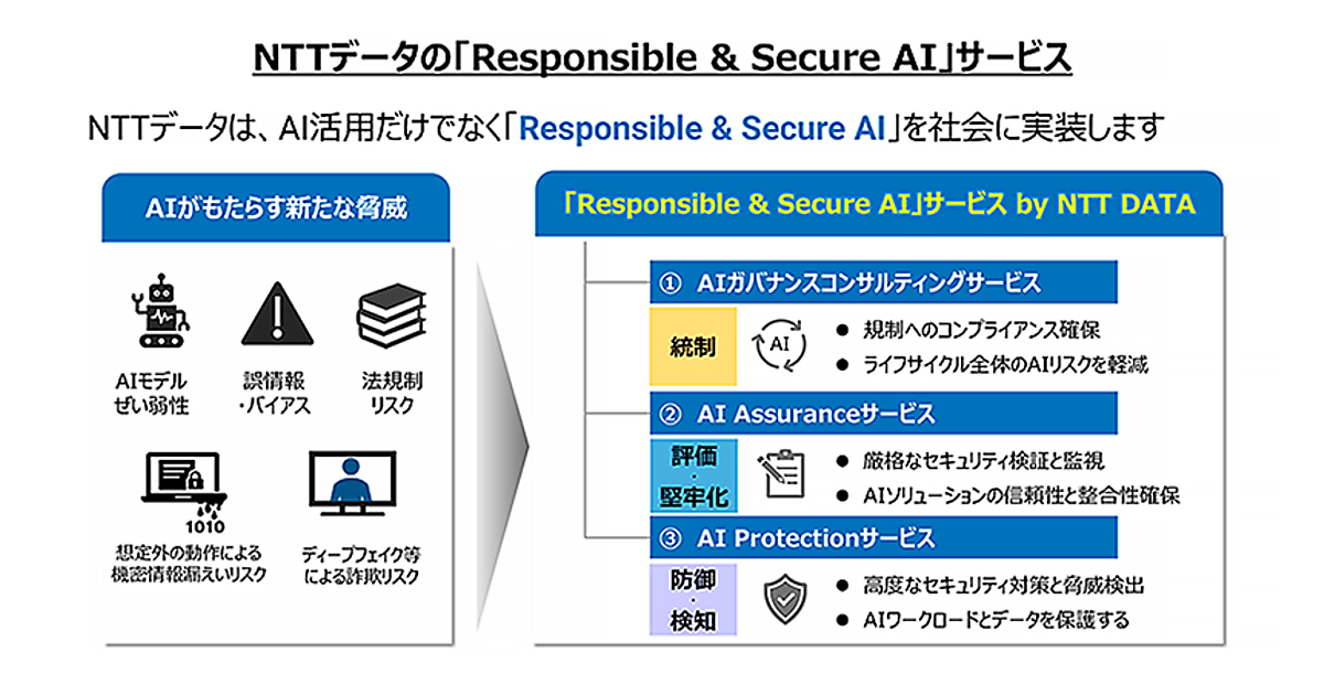 NTTデータの100%子会社のNTTデータ先端技術は、2026年1月からNTTデータが本格展開した企業のAI活用を支援する「Responsible & Secure AI」サービスに参画すると2月9日に発表した。同サービスは機密情報の漏えいや誤情報の出力などAI特有のリスクから企業を守るため、AIガバナンスの確立から実行までを一気通貫で支援するトータルソリューションで、NTTデータと共に継続的に高度化・拡充していく。