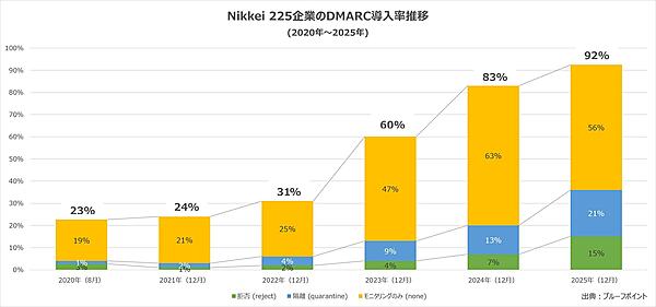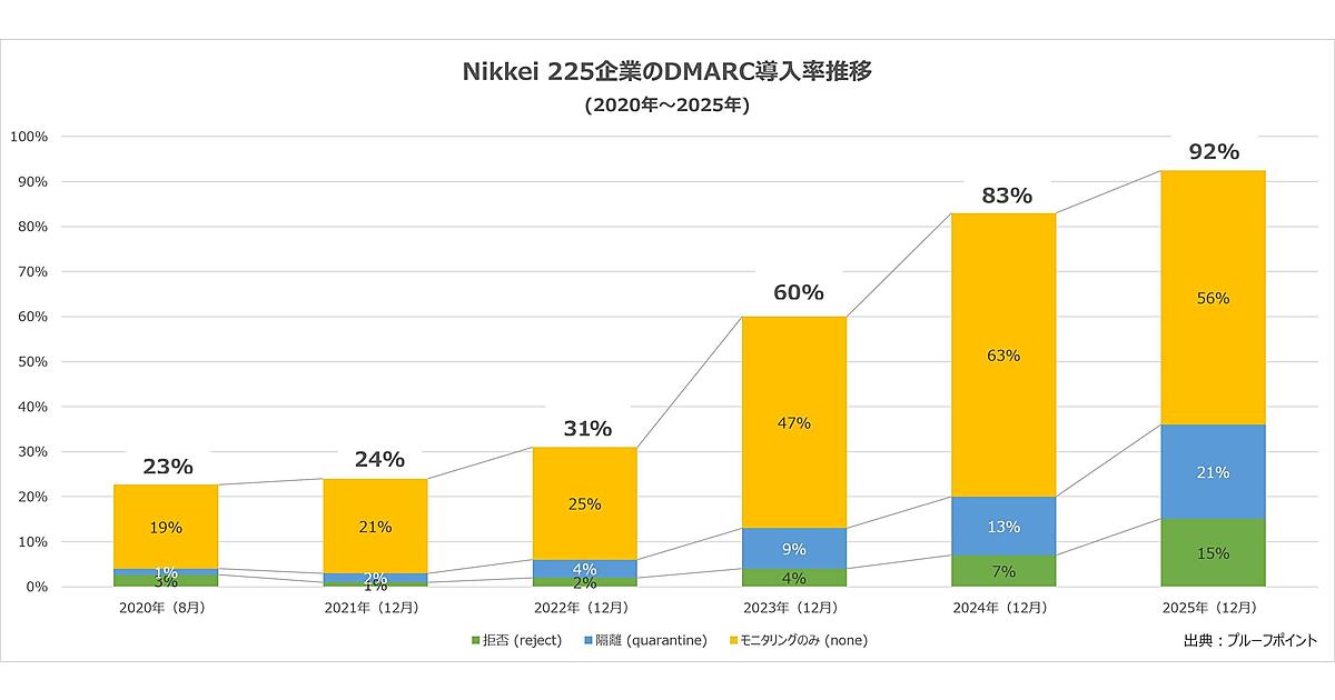今回の調査によると、日経225企業のうちDMARC認証を導入している企業は92%(前年83%)から9ポイント増加し9割を超えた。