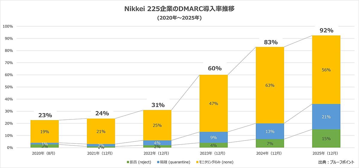 DMARC認証では「Reject(拒否)」「Quarantine(隔離)」「None(モニタリングのみ)」のポリシーレベルを設定できる。対策上有効とされる「Reject」に設定している日経225企業は15%(前年7%)、「Quarantine」に設定している企業は21%(13%)とともに上昇し強化が進んでいる。