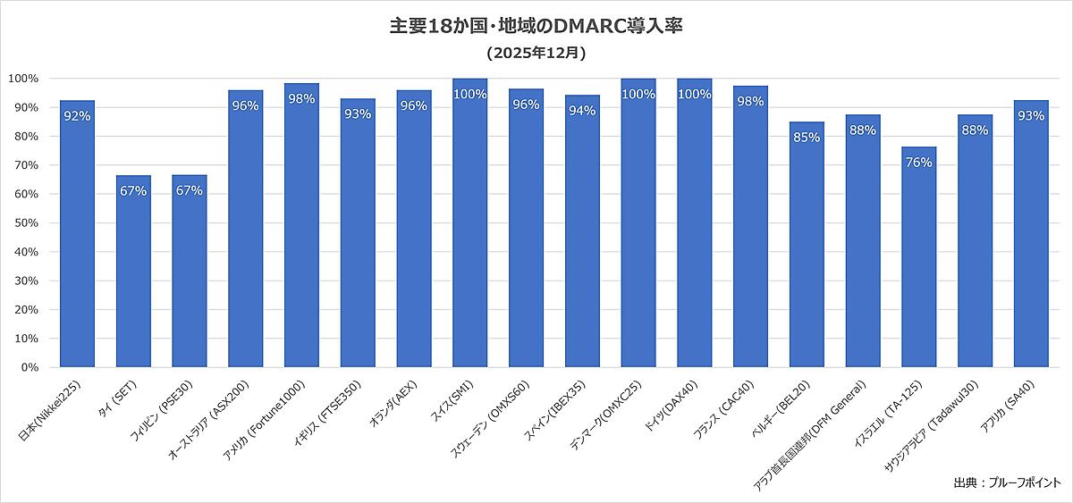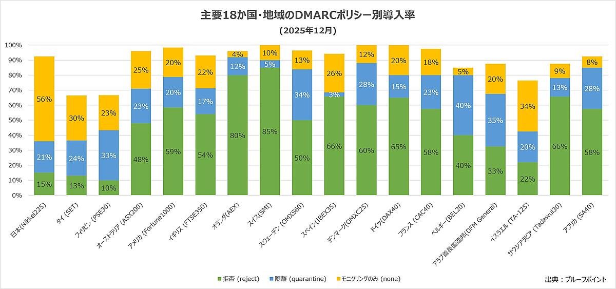 日本プルーフポイントは、「メールの安全性」に関する調査結果を発表した。日本を含む主要18か国の大手上場企業に対して、なりすましメール対策「DMARC」(Domain-based Message Authentication Reporting and Conformance)の導入/設定状況を調査している。