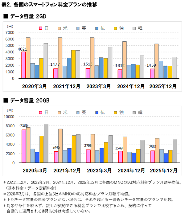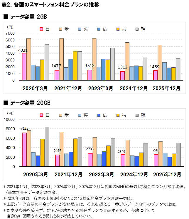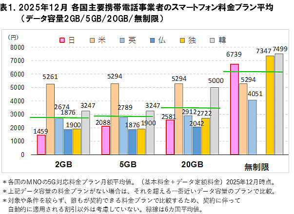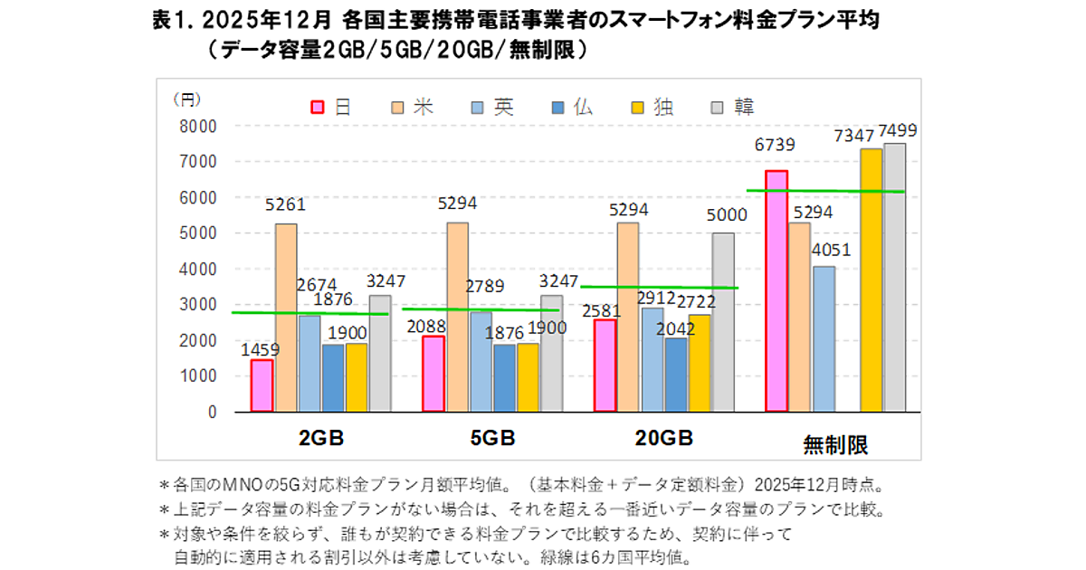 調査によると、2025年12月時点における6カ国の月額スマートフォン料金平均は、データ容量2GBでは2,736円、5GBでは2,866円、20GBでは3,425円、無制限では6,186円となった。