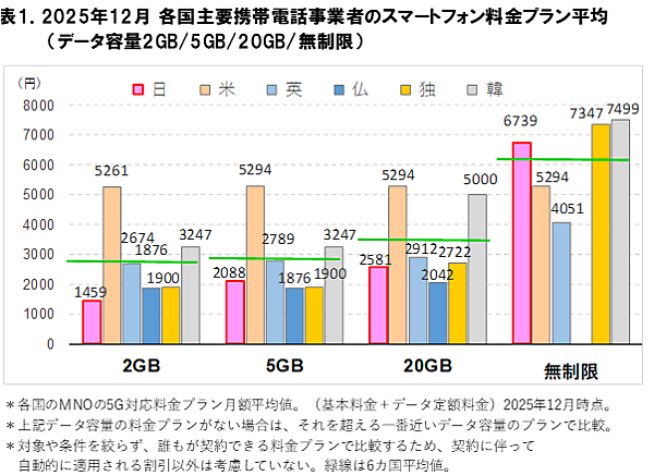ICT総研は、「2026年2月 スマートフォン料金の海外比較に関する調査」を実施した。日本・アメリカ・イギリス・フランス・ドイツ・韓国の6カ国の主要MNO(移動体通信事業者)について、月額平均料金を調べている。